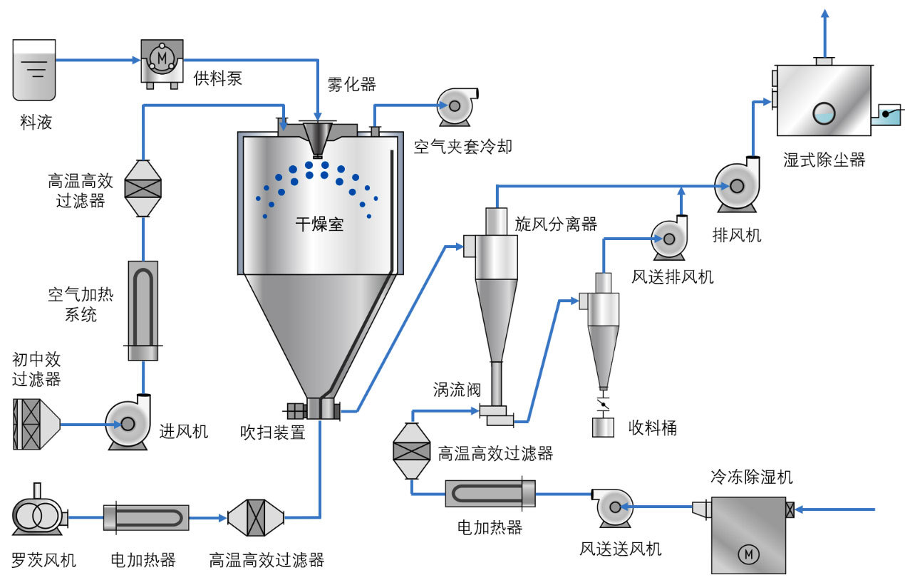 ?干燥室內壁采用空氣回轉吹掃系統以消除或減少粘壁現象。